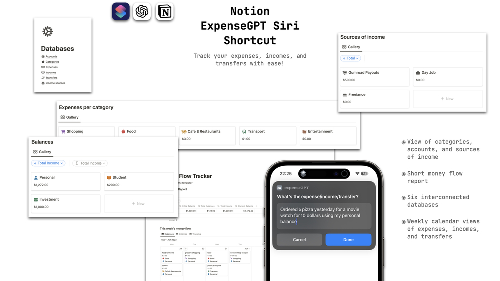 The Money Flow Tracking chatGPT shortcut with Notion is a powerful tool designed to help you effortlessly track your expenses, incomes, and transfers using natural language inputs. With the integration of Notion, a popular productivity and note-taking application, this shortcut provides a seamless experience for managing your financial records.