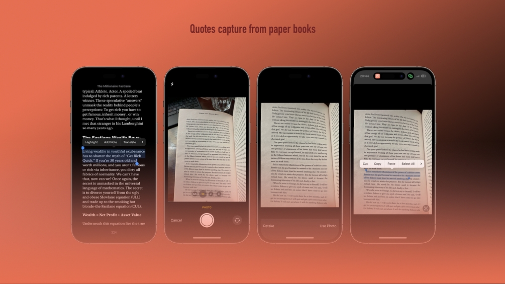 The purpose of this shortcut is the same as in previous one. Except, this time the shortcut allows you to select and copy a quote directly from a digital of physical book. If it’s a digital book, you can simply select text in Apple Books or Kindle and copy it to clipboard. Then, you need to run the shortcut to add the quote formatted as a quote block to the book’s page. If it’s a physical book, the shortcut uses Live Text feature to take a picture a book page and copy the text from the image.