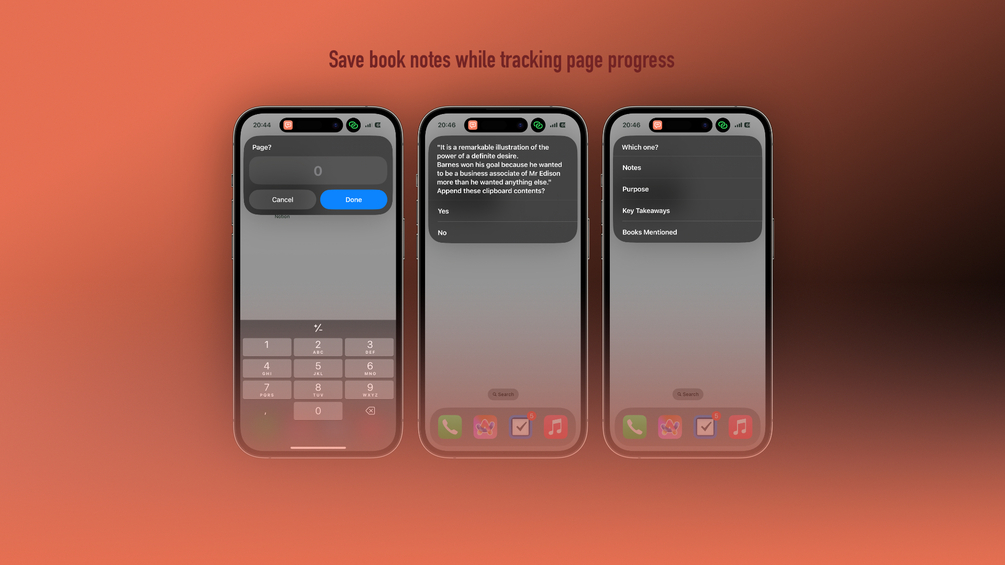 The purpose of this shortcut is to capture a piece of text spoken or written in your own words and add append it to the page of the book you’re currently reading. Your notes can be dictated or typed out. This shortcut shows a filtered list of book pages to choose from.