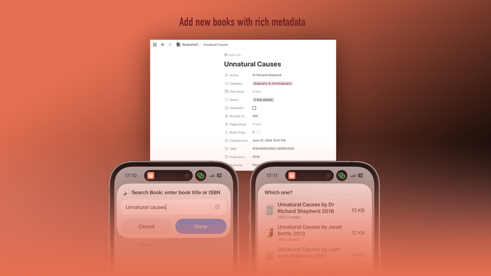 With the help of Google Books API, this shortcut allows you to create a new page for a new book with some metadata, like: author, published date, publisher, page count and genre.